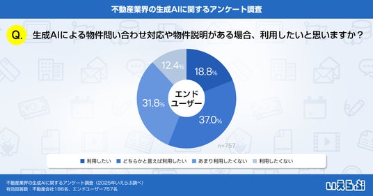 エンドユーザーに「生成AIによる物件問い合わせや物件説明がある場合、利用したいと思いますか?」と質問したところ、「利用したい」(18.8%)および「どちらかといえば利用したい」(37.0%)と答えた人は合わせて約半数となりました。一方で、「あまり利用したくない」(31.8%)および「利用したくない」(12.4%)と答えた人もほぼ同数を占めました。