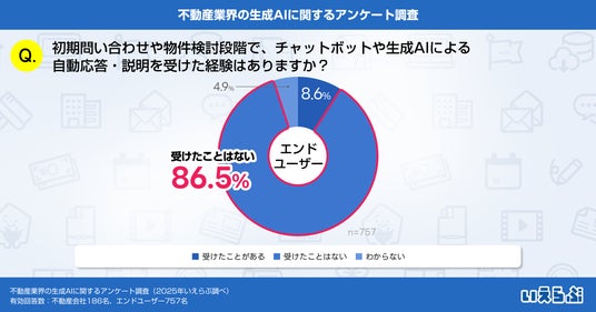 「初期問い合わせや物件検討段階で、チャットボットや生成AIによる自動応答・説明を受けた経験はありますか?」という質問では、「受けたことがある」(8.6%)や「わからない」(4.9%)という回答もありましたが、「受けたことはない」が86.5%と圧倒的多数でした。