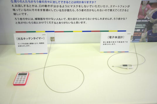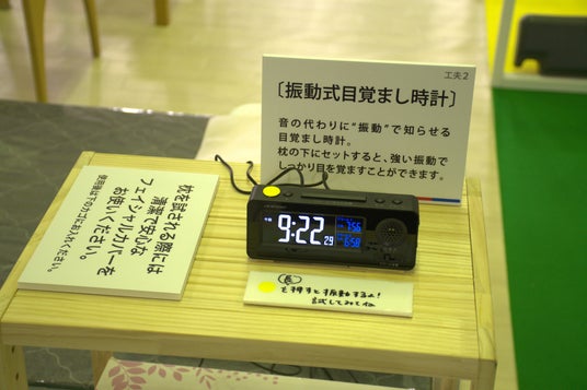 家の生活をイメージした空間に、聴覚障がい者の方が実際に使用している「光で知らせるインターフォン」や「音の代わりに“ 振動” で知らせる目覚まし時計」などを配置し、生活の工夫を感じられる展示を実施します。そのほかにも、「音と振動の両方で検温完了を知らせる電子体温計」や「ランプの点滅と振動により時間を知らせる光るキッチンタイマー」などを展示します。