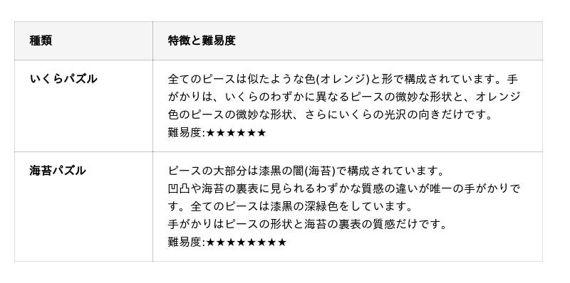 本商品は、当社の人気ネタである「いくら」「海苔」などの単一の食材をモチーフにした300ピースのジグソーパズルです。