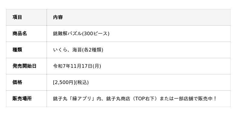 株式会社銚子丸(本社:千葉県千葉市美浜区、代表取締役社長:石井 憲)は、この度、寿司ネタへのこだわりを物理的な難易度で表現した新ノベルティグッズ「銚難解(ちょうなんかい)パズル」(300ピース)を、令和7年11月17日(月)より数量限定で発売いたします。