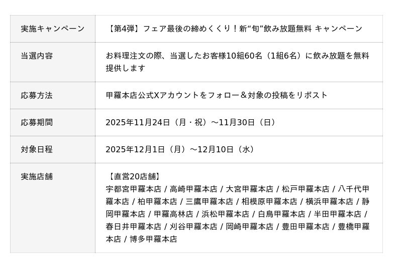 株式会社甲羅(本社:愛知県豊橋市、代表取締役社長:沼澤 裕)が、全国39店舗で展開するかに料理専門店「甲羅本店」では、2025年10月23日(木)より「新“旬”感謝祭」を開催中です。