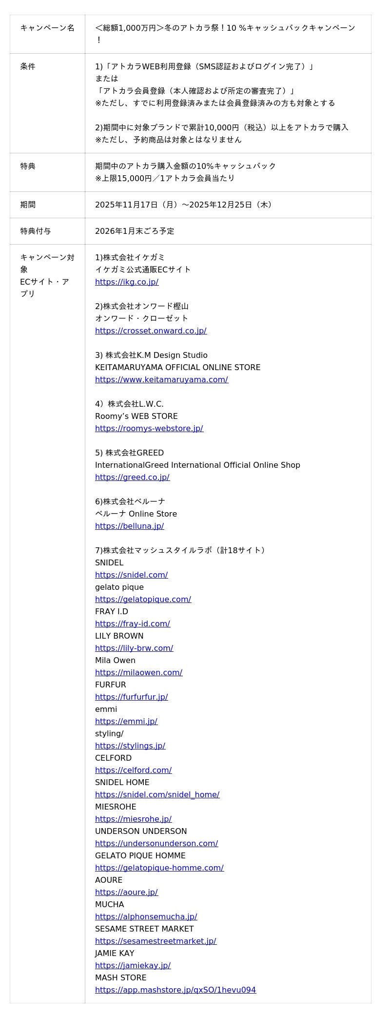 GMOペイメントゲートウェイ株式会社とGMOペイメントサービス株式会社、三井住友カード株式会社が運営するあと払いサービスの「アトカラ」は、2025年11月17日(月)からファッションブランドを展開する株式会社イケガミ、株式会社オンワード樫山、株式会社K.M Design Studio、株式会社L.W.C.、株式会社GREED International、株式会社ベルーナ、株式会社マッシュスタイルラボの5社とのタイアップキャンペーンを開催いたします。