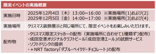 さらに、クリスマス限定のステッカー配布や、成田空港オリジナルクラフトビール「成田空港エール」、+NRT factory(※)の「ダブル・ベイクド・チョコレート」を無料でお楽しみいただける特別イベントも開催予定です。 この冬は、ぜひ成田空港にお越しいただき、心温まるクリスマスのひとときをお過ごしください。