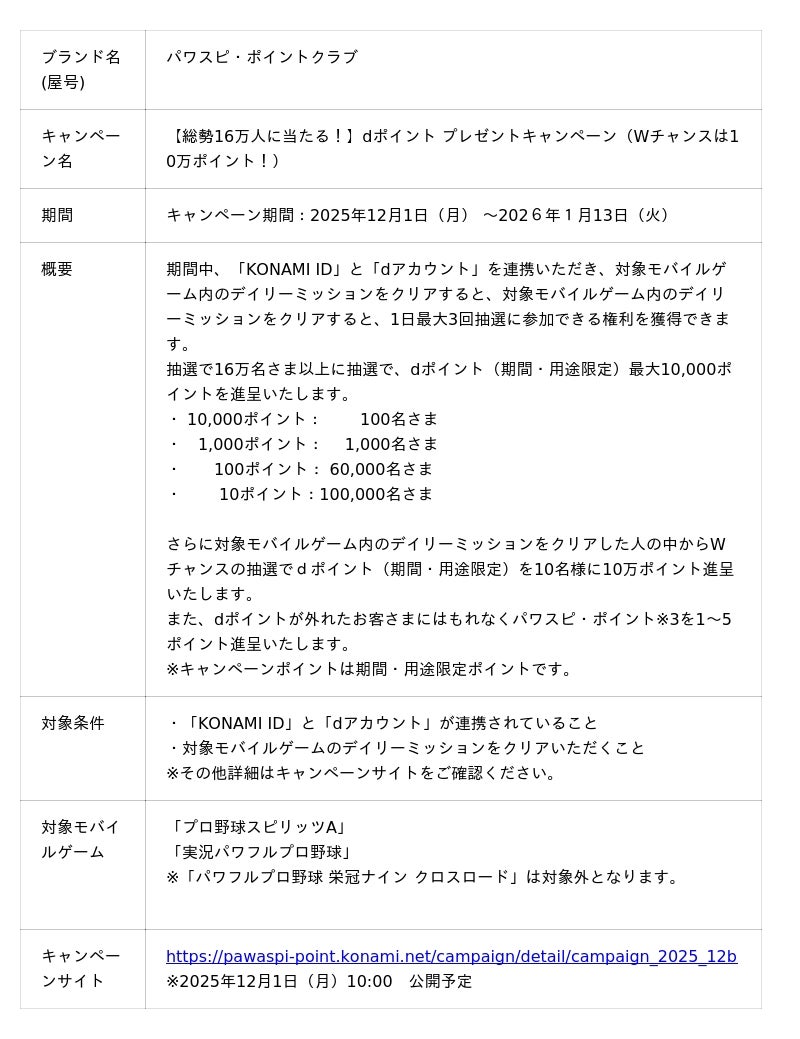 株式会社NTTドコモ(以下、ドコモ)は、パワスピ・ポイントクラブ※1において「総勢16万人に当たる!dポイントプレゼントキャンペーン(以下、本キャンペーン)」を、2025年12月1日(土)から2026年1月13日(火)までの期間で開催いたします。