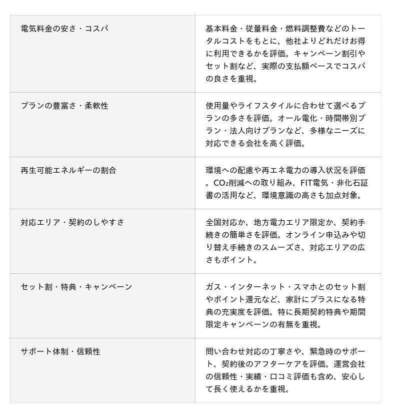 各提供会社については、実際の利用者からの口コミと、当メディアによる独自調査を掛け合わせランキングを掲載。評価基準の透明性を重視し、「電気料金の安さ・コスパ」「プランの豊富さ」「再生可能エネルギーの割合」「対応エリア」など、指標ごとの強み・弱みを可視化しました。これにより、従来のランキング形式のみでは見えづらかったリアルな評価を、ユーザー目線で提供しています。