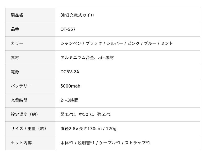 製品名:3in1充電式カイロ OT-S57