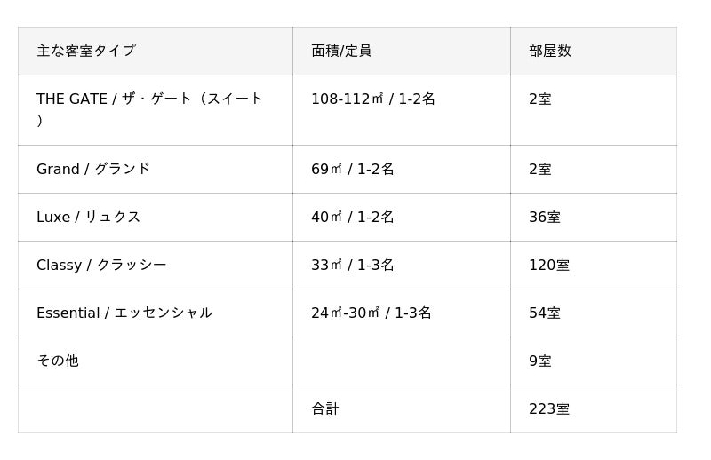 25階にある2つのスイートルーム「THE GATE (ザ・ゲート) 」(108-112平方メートル )は地上100mを超える高さにあり、天空での寛ぎの体験をご提供いたします。主力客室となる「Classy(クラッシー)」(33平方メートル )は、2つの洗面台を設置した豊かな水周り、窓辺にソファーなどを配置し、ゆったりと寛げる空間となっています。