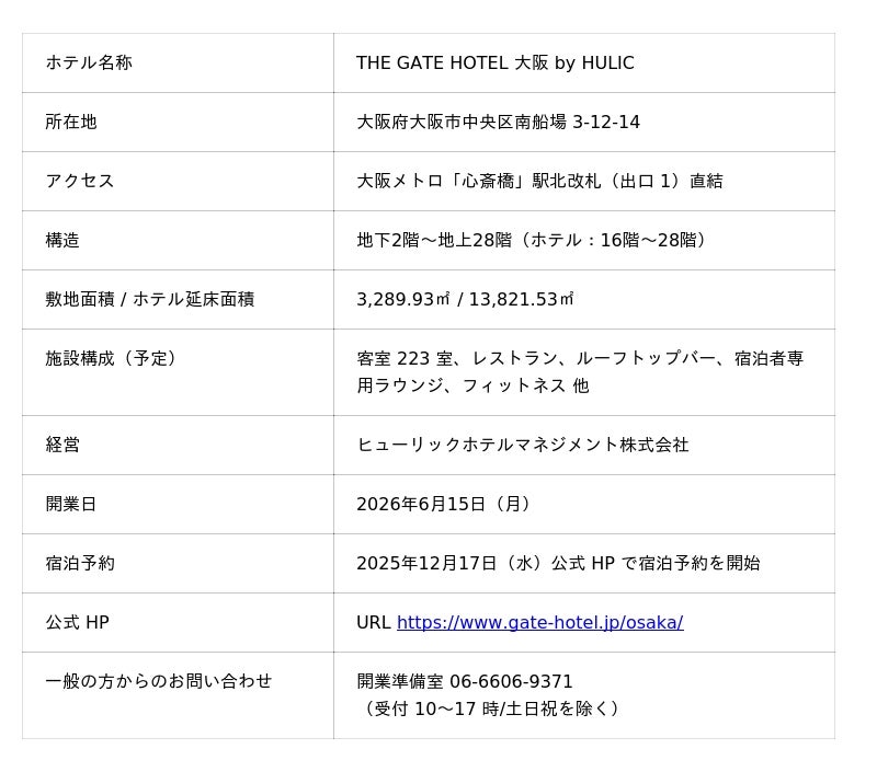 ヒューリックホテルマネジメント株式会社(所在地:東京都中央区日本橋小舟町13-8)は、2026年6月15日(月)に、ザ・ゲートホテルブランドとして国内8軒目となる関西エリア旗艦店「ザ・ゲートホテル大阪 by HULIC」(所在地:大阪府大阪市中央区南船場 3-12-14)を開業いたします。