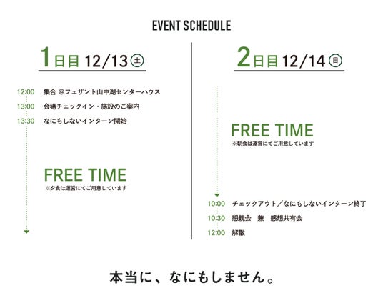 「なんにもない」ところから自らワクワクをつくり出すことのできる創造者たちとの出会いを楽しみにしています。情報、時間、予定、課題。何かに追われるいつもとは正反対の環境に身をおく2日間。頭を空っぽにして、こころを出発点に「はたらく」「暮らす」「生きる」の未来と向き合ってみてください。