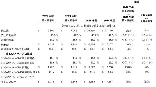 - 通年1株当たり利益:GAAPベースで過去最高の8.66ドル(前年度比1%増)、非GAAPベースで過去最高の9.42ドル(前年度比9%増)