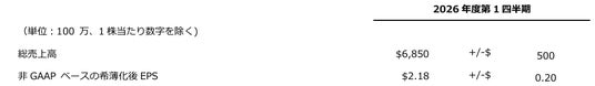 アプライド マテリアルズの2026年度第1四半期における売上高、非GAAP ベースの希薄化後1株当たり利益の見通しは、概算で以下のとおりです。