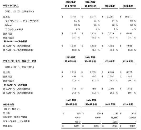 2025年10月26日に終了した3カ月および12カ月の「本社その他」の金額には、ディスプレイ関連の売上高(3億5,500万ドル、10億6,000万ドル)と営業利益(9,100万ドル、2億3,500万ドル)が含まれています。2024年10月27日に終了した3カ月および12カ月の「本社その他」の金額には、ディスプレイ関連の売上高(2億1,100万ドル、8億8,500万ドル)と営業利益(500万ドル、5,100万ドル)が含まれています。