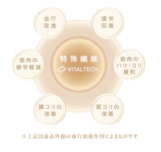 独自に開発した「血行促進繊維 VITALTECH(R)(バイタルテック)」により、一般医療機器区分「家庭用遠赤外線血行促進用衣」として、右記の6つの効果が期待できます。