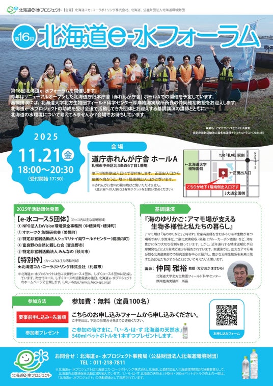 北海道では、北海道コカ・コーラボトリング株式会社、公益財団法人北海道環境財団との協働により、道内の水辺の環境保全活動に取り組む団体などを支援する『北海道e-水プロジェクト』を実施しており、この度、その一環として「第16回北海道e-水フォーラム」を開催します。