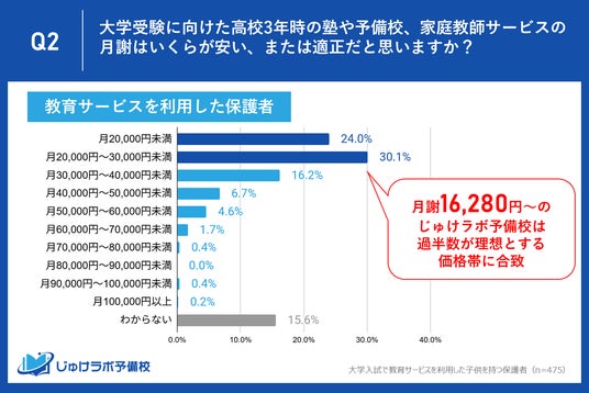 じゅけラボ予備校(所在地:大阪市北区、代表取締役:後藤智則)は、大学受験対策で教育サービス(塾・予備校・オンラインサービス含む)を利用した経験のある保護者475名と、「費用面での負担」を理由に利用しなかった保護者181名を対象に、「じゅけラボ予備校」の費用(月謝16,280円~、季節講習費なし)に関する意識調査を実施しました。