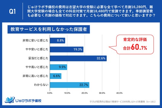 第二に、価格に最も厳しい視点を持つ、費用を理由に塾や予備校を諦めた家庭の60.7%からも「安い・妥当」との支持を得ました。