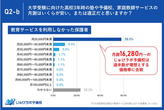 別で実施した調査で、この層の約6割が「月謝2万円未満」でなければ塾に通わせられないと回答していました。その厳しい目に「じゅけラボ予備校」の価格はどう映ったのか。