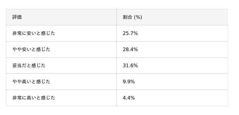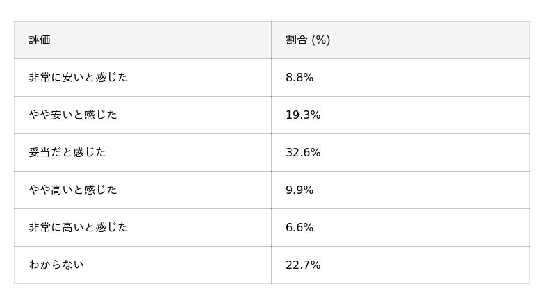 結果は、「非常に安い」(8.8%)、「やや安い」(19.3%)、「妥当」(32.6%)を合わせ、60.7%が肯定的に評価。