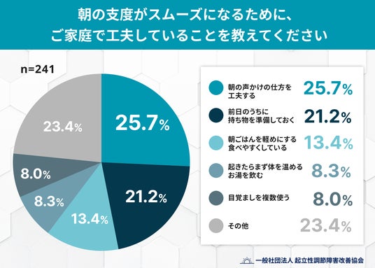 - 朝の支度をスムーズにする工夫として 「声かけを工夫する」25.7%「前日準備」21.2% が上位に挙げられる