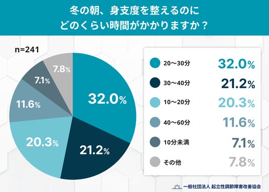 - 「子どもが冬になると朝起きづらくなる」と感じる保護者は 90.9%- 冬の身支度に20~30分かかる子どもが最多(32.0%)→春~秋は24.1%