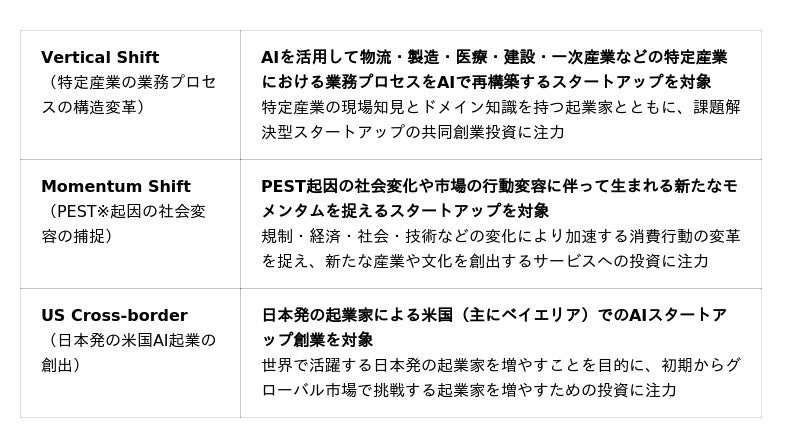 本ファンドでは、創業期~シード期の起業家を対象にAIを基軸とした「産業構造の変革(Vertical Shift)」、「PEST起因の社会変容の捕捉(Momentum Shift)」、「日本から世界を目指す起業家の米国越境起業(US Cross-border)」の3領域を重点投資テーマとし、起業家ニーズにあわせて共同創業投資または純投資で支援します。