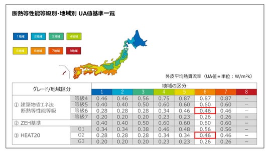 断熱等性能等級別・地域別 UA値基準一覧UA値(外皮平均熱貫流率)は、家から逃げる熱の量を示す、断熱等性能等級の最も重要な指標です。数字が小さいほど高性能で、全国を8つの気候地域に区分し、地域ごとに基準値が定められています。HEAT20 G2は、ZEH基準(等級5)を大きく上回る世界水準の高性能(等級6)であり、地域ごとの基準値と比較することで、その優位性がわかります。