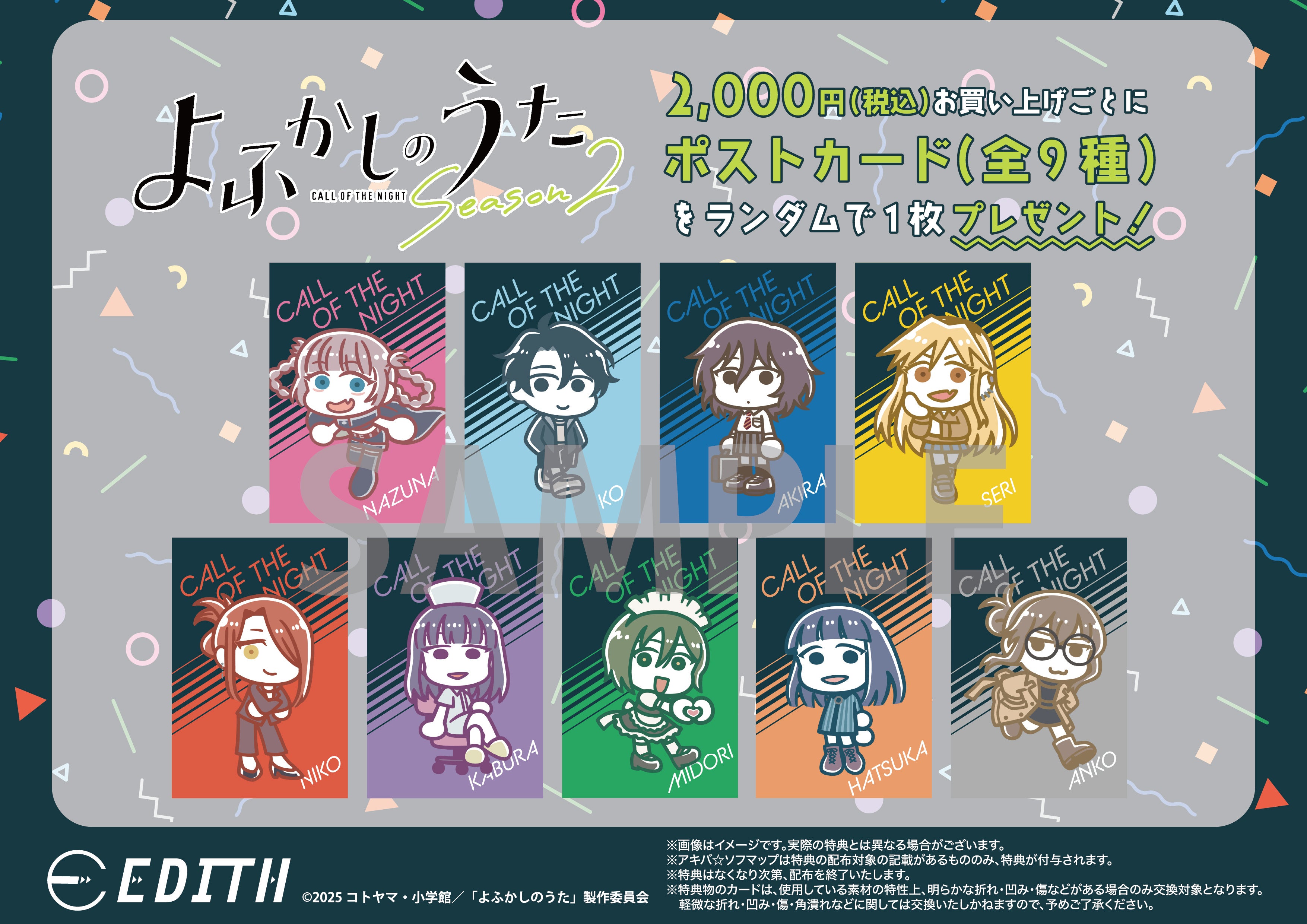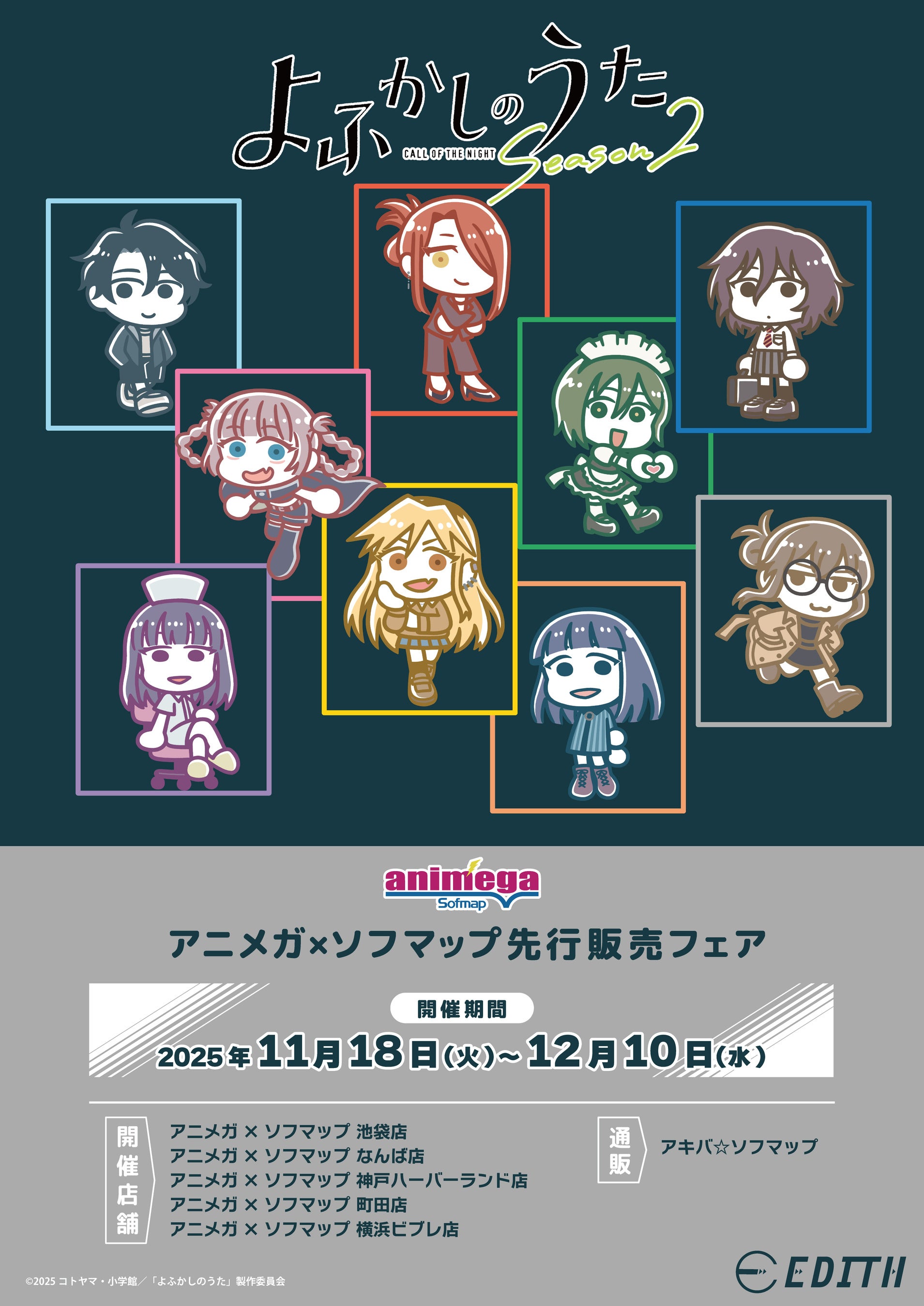 株式会社イーディス(本社:東京都豊島区、代表取締役:森俊平)は、TVアニメ『よふかしのうた Season2』のオリジナル描き起こしイラストを使用した商品をアニメガ×ソフマップで先行販売いたします。