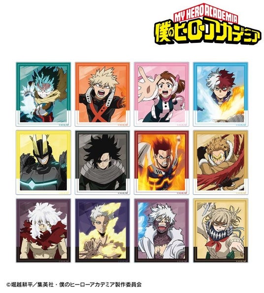 緑谷出久、爆豪勝己、麗日お茶子、轟焦凍、アーマード・オールマイト、相澤消太、エンデヴァー、ホークス、死柄木弔、オール・フォー・ワン、荼毘、トガヒミコのビジュアルをアクリルカードに仕上げました。