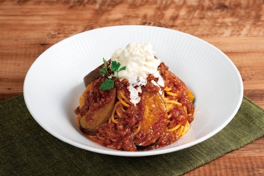 絶品ミートソースとみずみずしいなすのパスタ。とろりとした生モッツァレラチーズをパスタに絡めると、まろやかながらも濃厚な味わいに変化します。