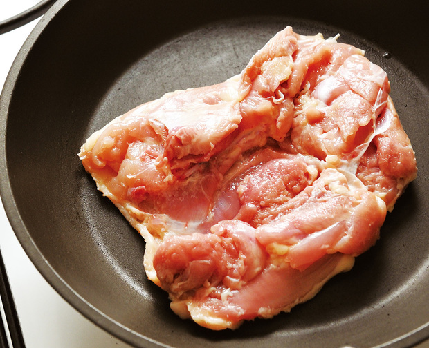 フライパンにサラダ油少々を入れ、鶏肉を皮目から入れ、弱火で熱す。冷たいフライパンに肉を入れてから加熱することで、肉がフライパンに密着し、そり返らず、皮がパリっと焼ける。