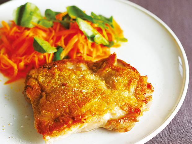 1.鶏肉は30分ほど室温におき常温に戻し、水気を拭き、焼く直前に塩をふる。