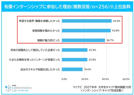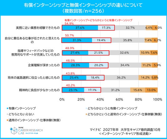 交通費や昼食代以外の給与が支払われるような「有償インターンシップ」に参加したことのある割合は17.8%だった。参加した理由を聞くと、「希望する業界・職種を体験したかった(44.6%)」が最多で、次いで「実務経験を積みたかった(43.8%)」、「報酬が魅力的だった(38.7%)」となった。また、「有償インターンシップ」と「無償インターンシップ」の違いについて聞いたところ、「実務に近い経験ができたもの(54.9%)」が最多で、次いで「自分に責任ある仕事が任されたと思えたもの(50.7%)」「教育的なサポートが充実していたもの(48.9%)」となったが、いずれの項目も「有償インターンシップ」が高い結果となった。「有償インターンシップ」は報酬があることで社会人としての労働の対価を得る経験ができるほか、「無償インターンシップ」よりも実務性や責任感を伴う経験ができることで、結果として学びの質が向上するという効果が期待できる。【図4、5、6】
