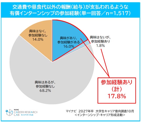 ◆給与が支払われる「有償インターンシップ」の参加率は17.8%。「有償インターンシップ」では、実務性や責任感を伴う経験ができたという声も
