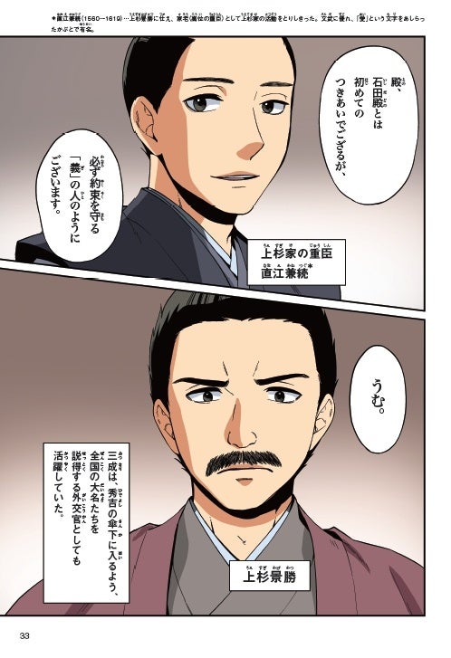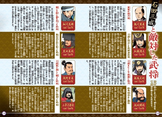 見返しページには関ヶ原の戦いの配置図を掲載! 巻末ページは石田三成の業績や、関連人物紹介、年表、そして石田三成の名言などもそろっているので、まんがの内容をより深く理解できると同時に、大河ドラマの予習にもぴったりです。