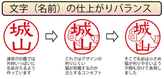 あえてそこに重ねるように名前を配置し、猫が名前の邪魔をしているように見えるハンコです。