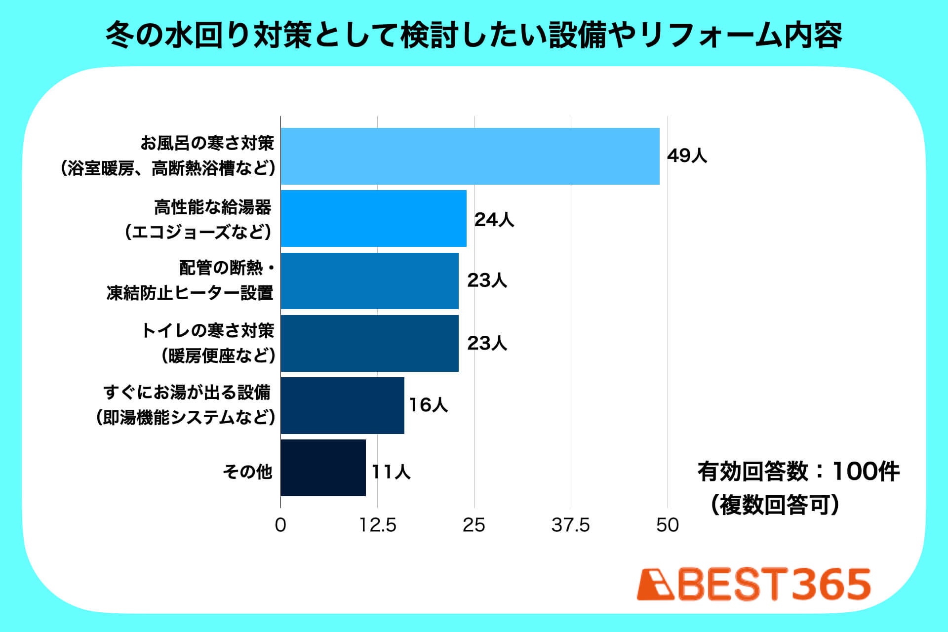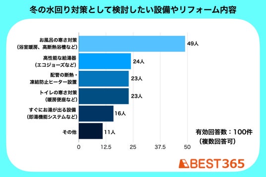 本アンケートで「これからの冬場の対策として、水回りにあると助かる設備や、検討したいリフォーム内容」についても調査したところ、最も関心が高かったのは「お風呂の寒さ対策(浴室暖房設置、高断熱浴槽などの導入)」で、100人中49人からの回答を得ました。
