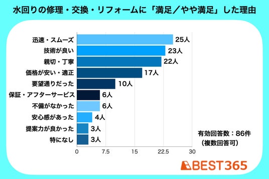 満足した理由は「対応が迅速・スムーズ(25人)」「技術が良い(23人)」「丁寧・親切(22人)」が最多でした。