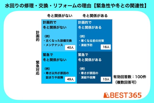 今回のアンケートでは、実施した修理・交換・リフォームが「メンテナンスなどのために計画的に行なったものか、もしくは緊急性の高いものだったか」また「冬の寒さと関係のあるものだったか」も調査しました。
