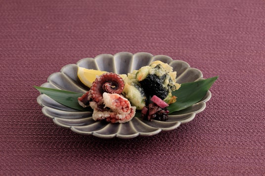 やなぎだこを塩麹で漬け込み、から揚げにしました。あおさ海苔入りのとろろ海苔巻き天ぷらは、ふんわりとした食感をお楽しみいただけます。