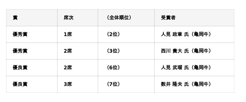 亀岡市内生産者が優秀賞1席・2席、優良賞2席・3席(全体2位、3位、6位、7位)を受賞し高品質な飼育技術を証明