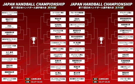 第77回日本ハンドボール選手権男子組み合わせ(左)、女子組み合わせ(右)