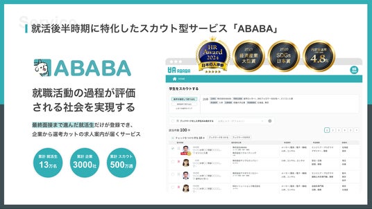 「ABABA」は選考の過程を評価することで「就職活動うつ」に悩む就活生の心理的ストレスの軽減に寄与しながら、企業のブランディング保持にも貢献し、社会課題と事業課題の双方を解決するサービスです。