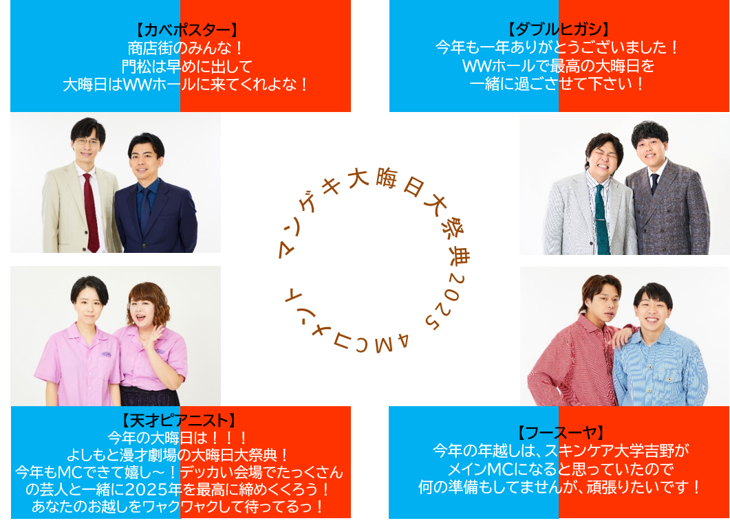 今年のマンゲキ「大晦日大祭典2025」は“ボケVSツッコミ”をテーマに青組と赤組に分かれて、カベポスター・天才ピアニスト・ダブルヒガシ・フースーヤの4MCが激しいバトルを繰り広げます。