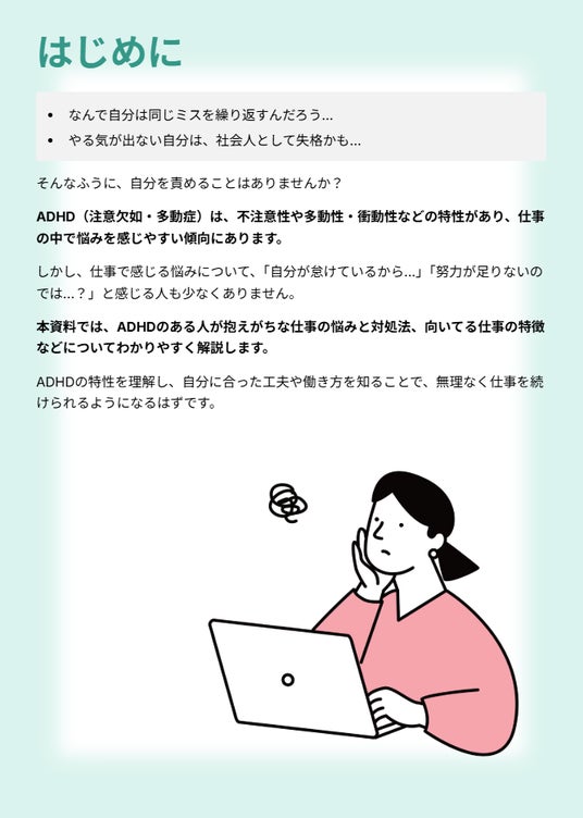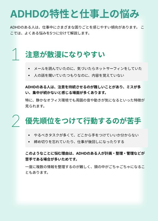 本資料では、ADHDのある人が仕事で抱えやすい困りごとや、特性別の対処法、向いてる仕事の選び方などについて、わかりやすく解説しています。