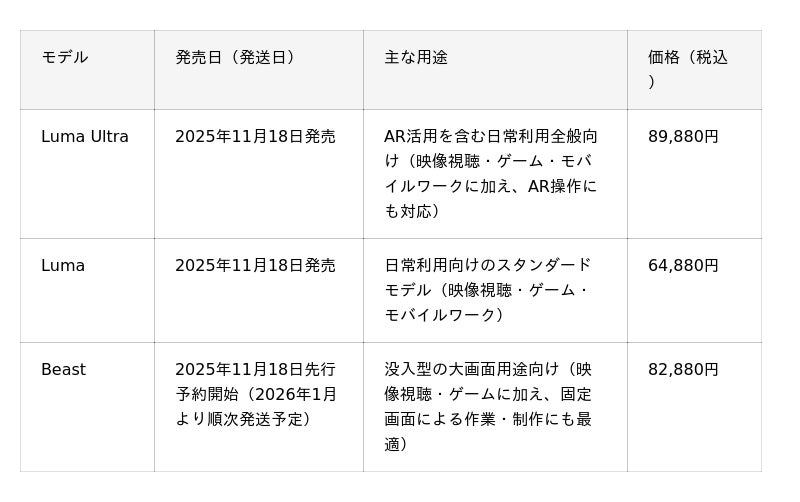 「Luma Ultra」と「Luma」は本日2025年11月18日(火)より発売、「Beast」は同日より先行予約を開始し、2026年1月より順次発送を予定しています。さらに、コントローラーやレンズアクセサリー、ドックカバー/アダプターなど、操作性と没入感を高める純正アクセサリー7製品も同日リリースします。
