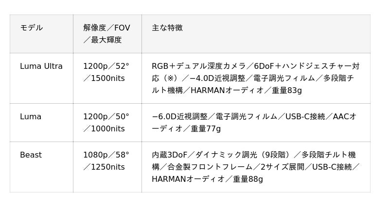 主力モデルとなる「Luma Ultra」は、シリーズ最高輝度とAR機能を備えたハイエンドXR/ARグラスです。すでに米国市場では高い販売構成比を記録しており、日本市場でも映像視聴・ゲーム・モバイルワークといった日常利用に加え、ARを活用した新しい使い方にも対応する万能型モデルとして展開します。