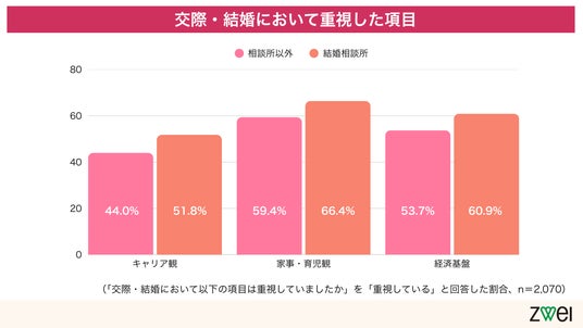 婚活中に重視した項目として、結婚相談所利用者は「相談所以外」の人と比べ、「キャリア観」(+7.8P)、「家事・育児観」(+7.0P)、「経済基盤」(+7.2P) といった、将来の生活設計に直結する項目をより重視する傾向が見られました。