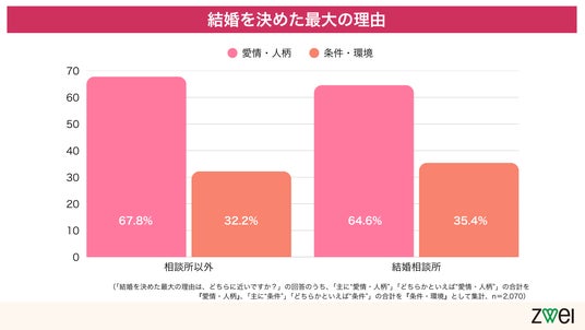 これは「相談所以外」の出会い(67.8%)と比べても、わずか3.2ポイントの差しかありません。出会いのきっかけが「条件」であったとしても、最終的な結婚の意思決定は、他の出会い方と同様に「愛情・人柄」に基づいて行われている実態が明らかになりました。