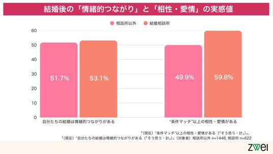 また、「自分たちの結婚は情緒的つながりがある」という回答も、「相談所」(53.1%) が「相談所以外」(51.7%) と遜色ない結果となっています。